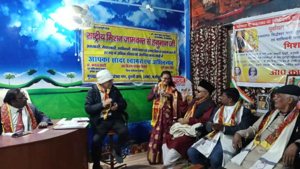 Ghazipur: श्री राममय कवि सम्मेलन गाजीपुर जिलांतर्गत सिद्धेश्वर कालोनी, लंका के जिला पत्रकार समिति हाल में “मिशन जामवंत से हनुमान जी” एवं अखिल भारतीय लेखक कवि ‌कलाकार परिषद के संयुक्त तत्वावधान में श्री राम मय कवि सम्मेलन का आयोजन किया गया. कवि सम्मेलन ‌का शुभारंभ माधुरी ‘मधु’ के वाणी वंदना से हुआ. तत्पश्चात् संजय पांडे ‘सरस’की कविता- हजार करवटें लेता रहा लेकिन मना हूं मैं यहां अंधेरों में रोशनी की तरह. तालियां बटोरी. गीतकार हरिशंकर पांडेय ने -तरक्की के सोपान चढ़ तो रहे इस तरक्की में अब लापता हैं पिता. सुनाकर खूब तालियां अर्जित की. ख्यातिप्राप्त प्रबन्धकार कामेश्वर द्विवेदी की कविता-वाणी में सुधा की धार भीतर भरा है विष चेहरे पै चेहरा लगा के नर छलता.