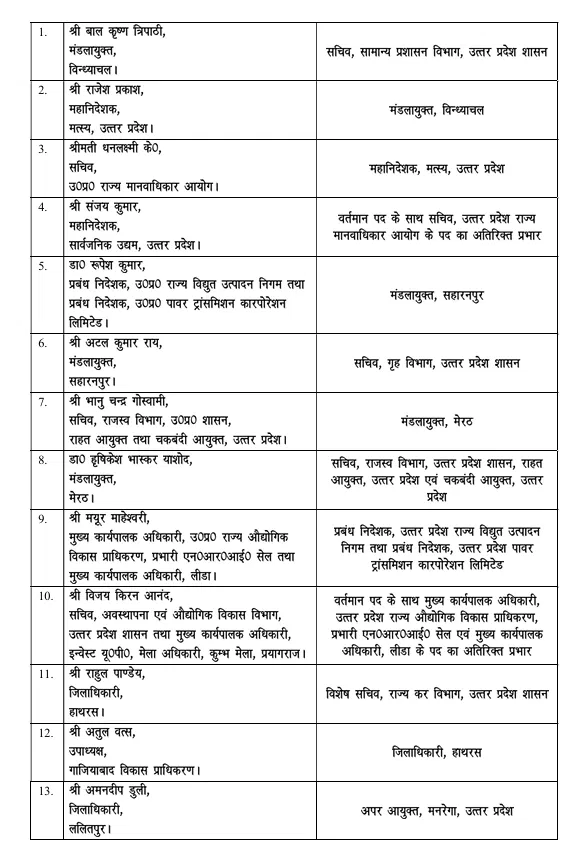 इसी तरह मयूर माहेश्वरी को प्रबंध निदेशक उत्तर प्रदेश राज्य विद्युत उत्पादन निगम और प्रबंध निदेशक उत्तर प्रदेश पावर ट्रांसमिशन कॉरपोरेशन लिमिटेड के पद पर तैनात किया गया है विजय किरण आनंद को वर्तमान पद के साथ मुख्य कार्यपालक अधिकारी उत्तर प्रदेश राज्य औद्योगिक विकास प्राधिकरण प्रभारी एनआरआई सेल एवं मुख्य कार्यपालक अधिकारी लीडर के पद का अतिरिक्त प्रभार दिया गया है।